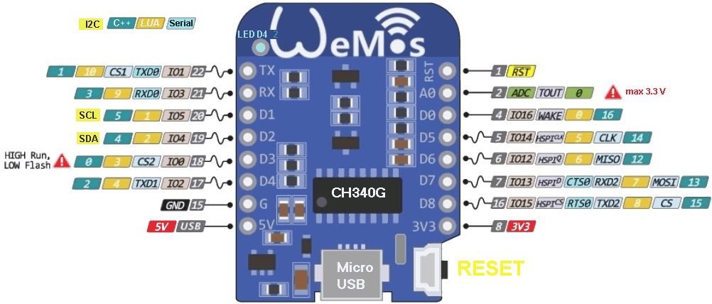 Aufdrucke entsprechen NICHT den Portnummern!! D2==GPIO4